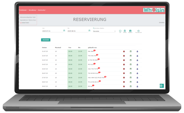 Unser Raumbuchungssystem "whoisinmelder" ist ein für den Endbenutzer einfach und intuitiv zu bedienendes System zur Reservierung/Buchung von Räumen, Arbeitsplätzen, Terminkalendern und anderen buchbaren Objekten.