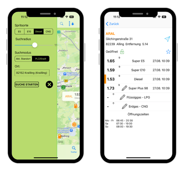 - parallele Preisanzeige für zwei gewählte Spritsorten in Kurzansicht